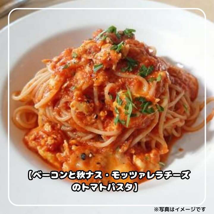 ・ベーコンと秋ナス・モッツァレラチーズのトマトパスタ